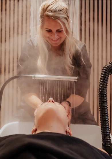 De Deluxe Treatment biedt een volledige wellness ervaring. Deze behandeling begint met een analyse van de hoofdhuid en het haar, gevolgd door een persoonlijke behandeling. Dit omvat een hoofdhuidreiniging met een scrub en detox, een uitgebreide ontspannende hoofd-, nek-, hand- en schoudermassage, een verzorgend hoofdhuid- en haarmasker, en een stoomsessie. Vervolgens knippen en föhnen we het haar.